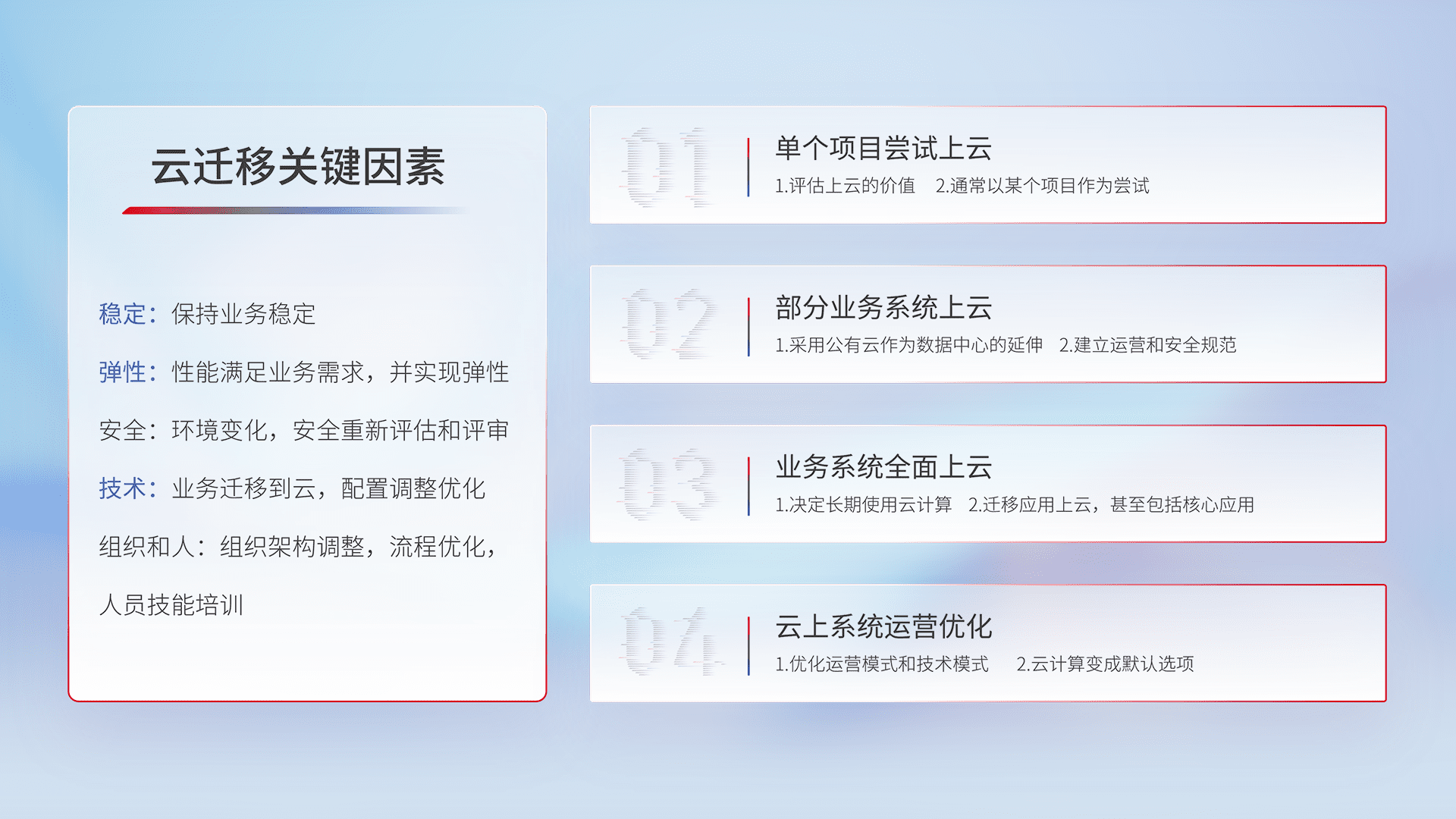 结合实际业务,,,从规划设计、、、、云平台选型、、云原生改造、、、数据迁移、、集成交付,,,迁移全过程为客户识别最佳上云路径,,,,做好风险识别管理,,,设计网络架构、、、身份权限、、、安全审计合规、、、操作审计、、日志审计、、、监控告警策略、、多站点容灾设计等,,,,对云上基础设施进行整体规划,,,,提升IT治理水平,,,,以满足弹性、、、、高可用、、、、高性能的需求。。。
