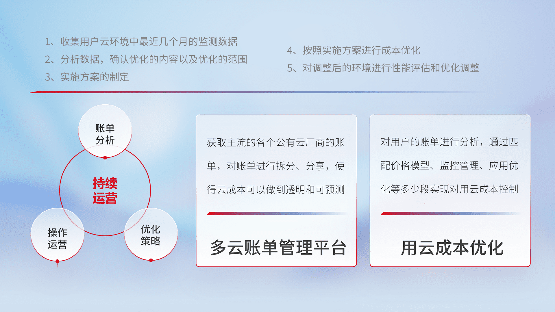 通过多云纳管,,,,以统一的资源数据模型把客户的云资源进行抽象和封装,,进而实现对多云资源的统一操作,,保障云资源管理的可靠性、、、、稳定性与可用性。。。量身定制化运维内容,,,配置、、、开发运维、、、、补丁管理、、备份、、、、监控、、、认证和访问管理、、、审计和日常巡检等,,,,保障在用云过程中的可靠度,,,,稳定度以及高可用率。。。