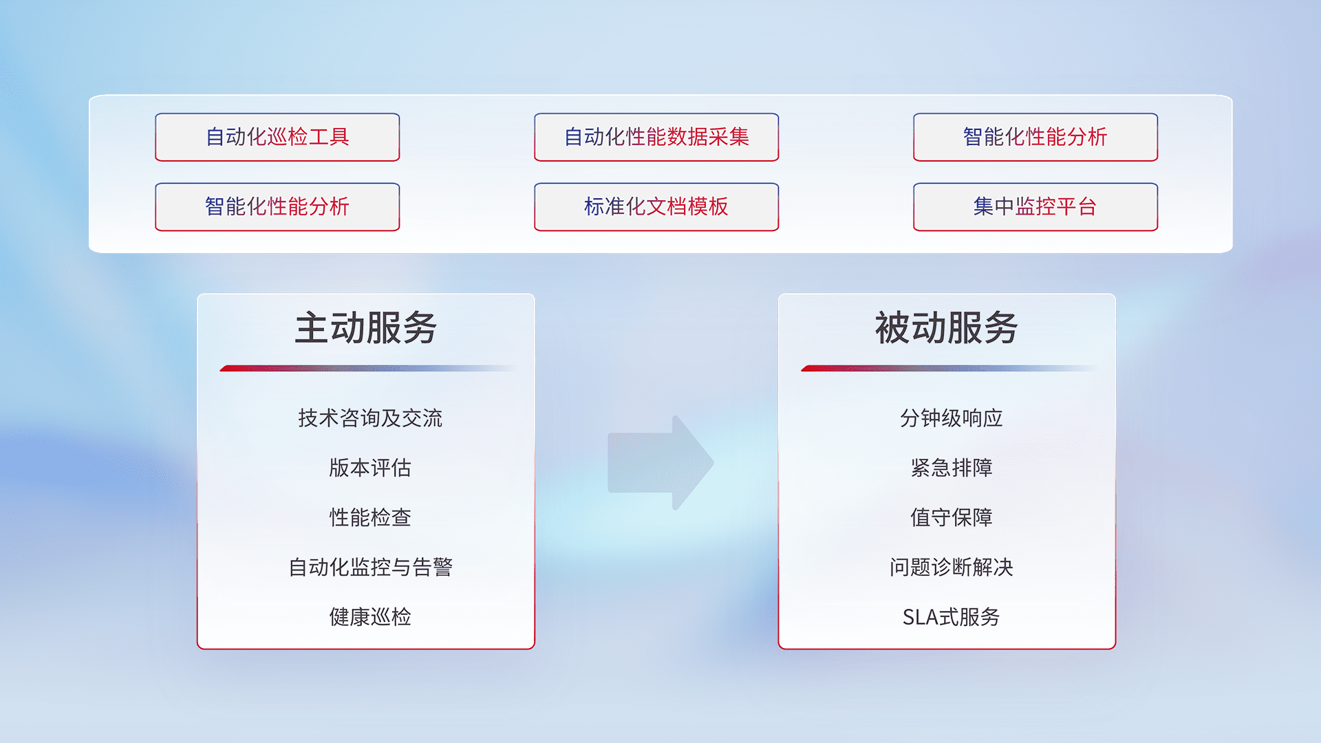 智能化工具和标准化文档,,,保障服务质量,,,提供主动服务(包含技术咨询、、、版本评估、、性能检查、、、自动化监控与告警、、、、健康巡检)和被动服务包含(分钟级响应、、、、紧急排障、、、值守保障、、、问题诊断解决、、SLA服务)。。。。